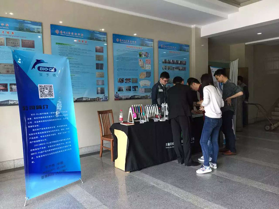 2016年5月9日-5月12日,寶予德(中國(guó))春季高校儀器巡回展第五站在江蘇三所著名高校如期舉行,BIO-DL寶予德和當(dāng)?shù)卮砩毯献髡钩隽艘埔合盗挟a(chǎn)品和分子生物學(xué)相關(guān)實(shí)驗(yàn)儀器。優(yōu)良的產(chǎn)品,貼心的服務(wù),精美的禮品,吸引了許多科研工作者前來(lái)問(wèn)詢(xún)。 在巡展中,BIO-DL寶予德維修工程師現(xiàn)場(chǎng)為用戶(hù)進(jìn)行移液器校準(zhǔn)及維護(hù),技術(shù)專(zhuān)員與老師、同學(xué)們熱情互動(dòng),答疑解難,加強(qiáng)了用戶(hù)對(duì)移液器規(guī)范操作和日常維護(hù)的了解。 下面是活動(dòng)回顧: