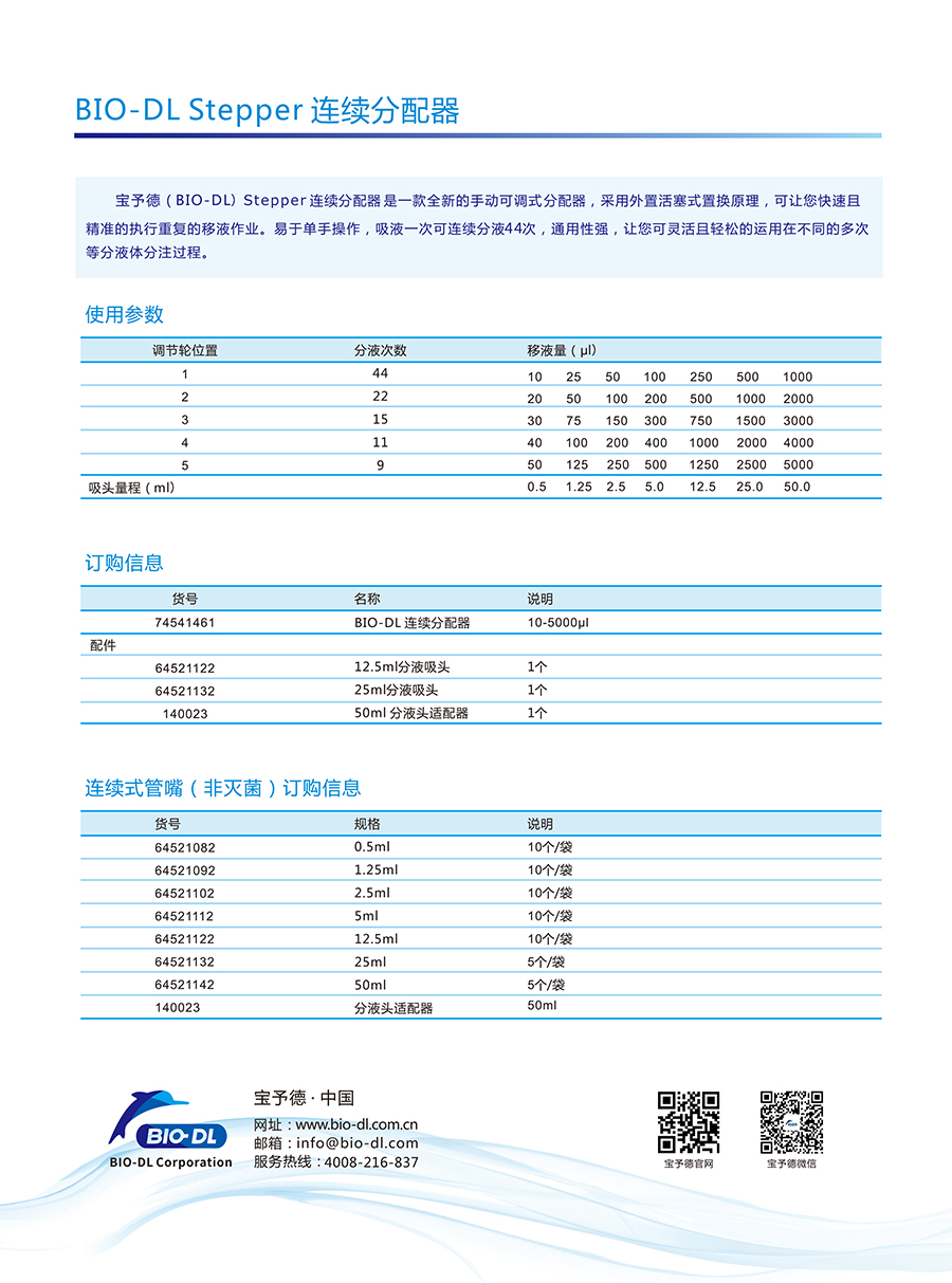 Stepper連續分配器是一款全新的手動可調式連續分配器,采用外置活塞置換原理,可讓您快速且精確的執行重復的移液作業。
